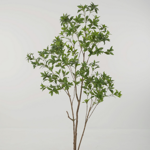 The trunk is shaped and finished to mirror authentic wood grain variation, enhancing depth and believability. The overall construction ensures the tree reads as botanical rather than artificial, convincing both visually and tactilely.